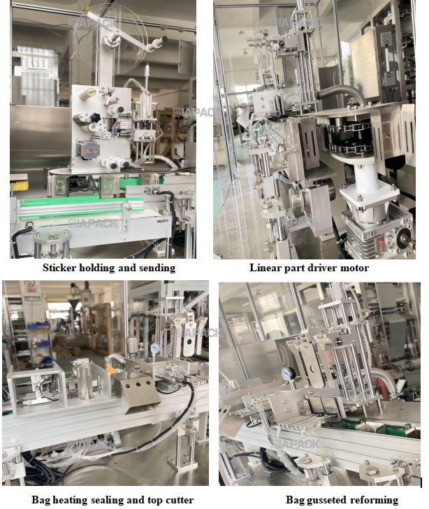 Mesin ini adalah reka bentuk khas untuk membuat beg gusset dengan pelabelan atas. Selepas beg penuh dengan produk jatuh pada mesin ini. Mesin ini akan membawa beg, melalui satu kali lipat mulut beg dan kemudian melekatkan label. Rangka mesin yang dibuat oleh SUS304 .PLC dan skrin sentuh diguna pakai oleh jenama Siemens .Dan bahagian pneumatik mengguna pakai jenama SMC .Komponen Elektrik Utama menggunakan jenama Omron dan Schneider. Mesin ini berfungsi dengan mesin pembungkusan automatik untuk mencapai pelabelan atas beg siap. Mesin ini boleh mencapai fungsi secara automatik daripada label dipisahkan , Penghantaran label . Pengesan label dan menekan label .