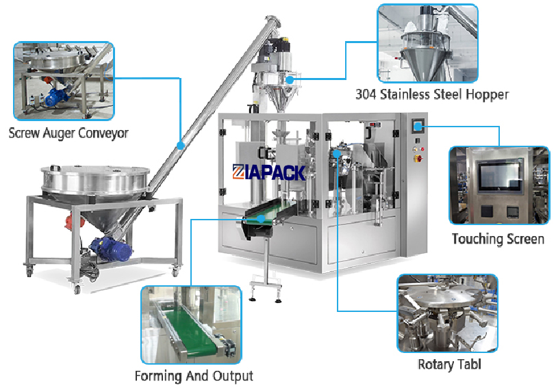 Mesin ini boleh autoamtic mengambil beg, membuka beg, mengisi bahan dan mengelak beg. Digunakan secara meluas untuk pembungkusan bahan serbuk yang berbeza.